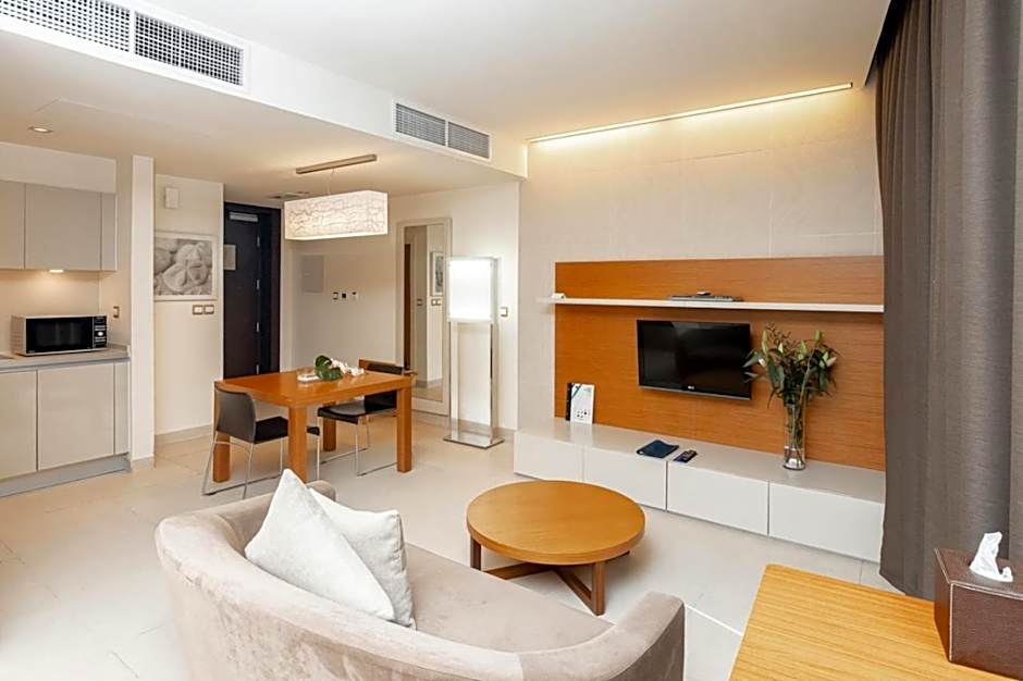 This spacious apartment features a private balcony overlooking cityscape, mini-bar, flat-screen cable TV, and a fully equipped separate kitchen.
